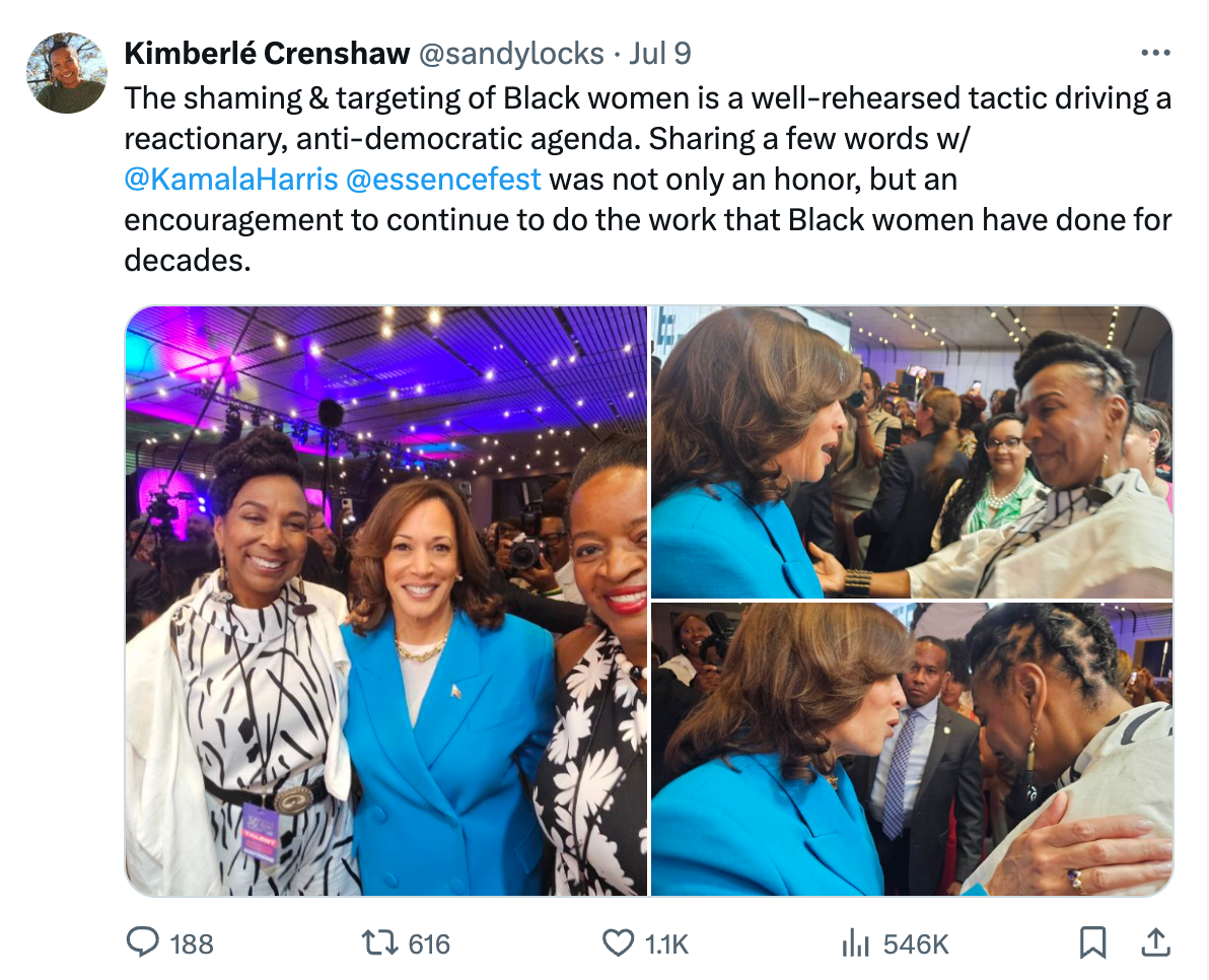 This tweet from July 9 by Professor Crenshaw from the Essence Fest has prompted a lot of discourse on the socials about what liberation looks like, and what it doesn’t. This version of intersectionality that relies solely on the representation of certain identities in power yet without considering the geopolitical location and support of imperialism, colonial dispossession, and genocide is not any kind of “feminism” that I recognize or want to be part of.