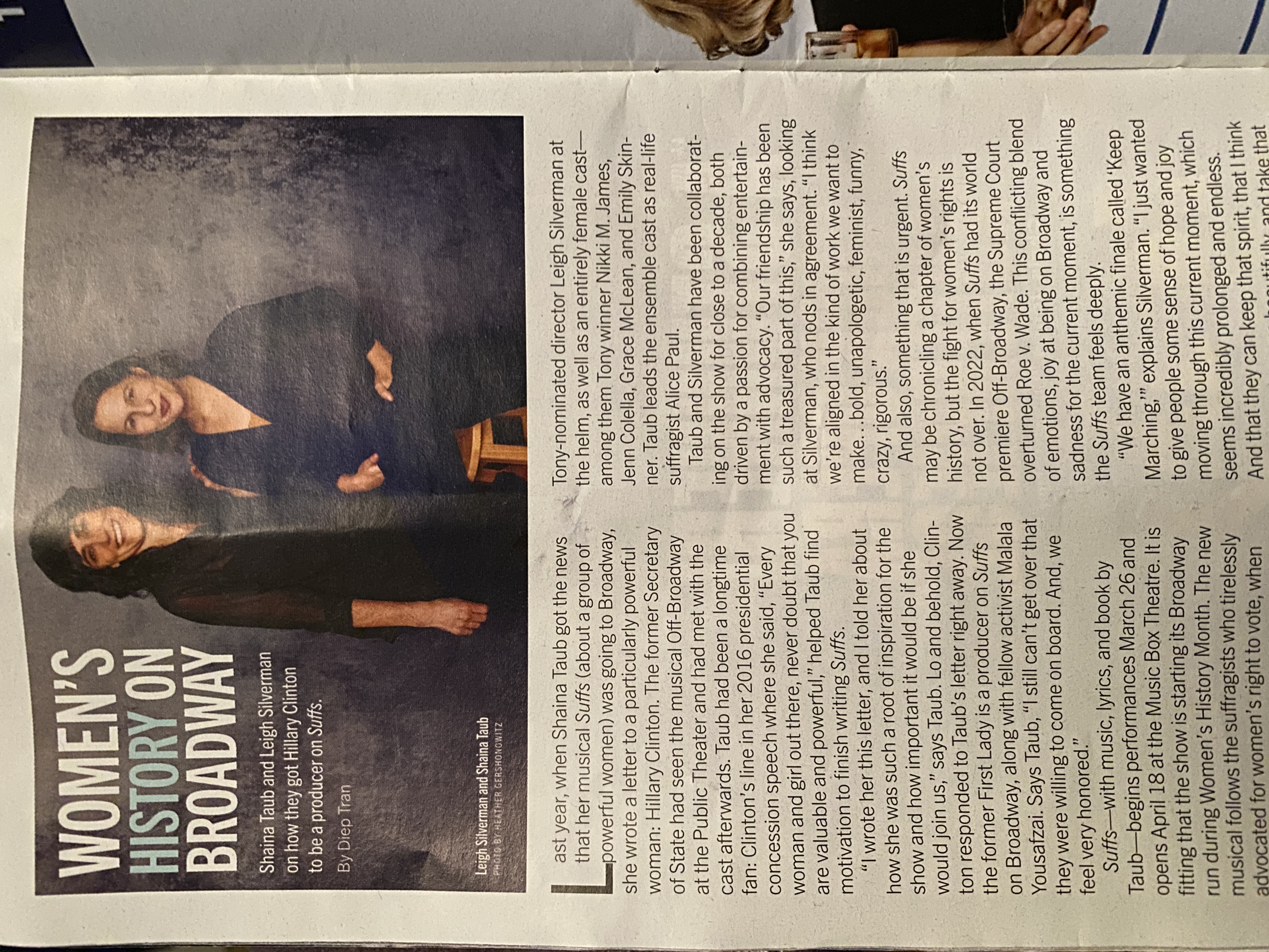 The comparison between “SUFFS” and “Hamilton” is apt because it is so clearly the model that Taub, Silverman and the producers of the show are following in their retconning of history. In the playbill for the show, Taub (playwright) and Silverman (director) appear under the headline, “Women’s History on Broadway.”