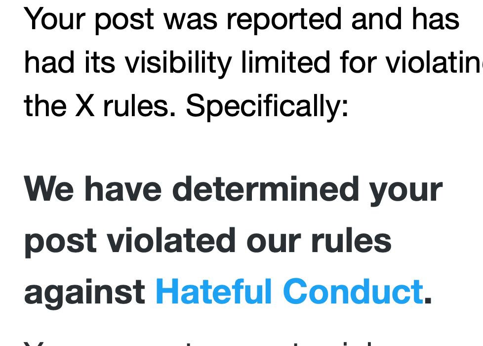 Later in the day, I tweeted out some lines from Schotten’s article, “TERFism, Zionism, and Right-Wing Annihilationism: Toward an Internationalist Genealogy of Extinction Phobia,” and someone reported my posts as “hateful” speech. Someone on there alerted me to the fact that it might have been the word “cis” as in cisgender which flagged my post. I’m not sure.