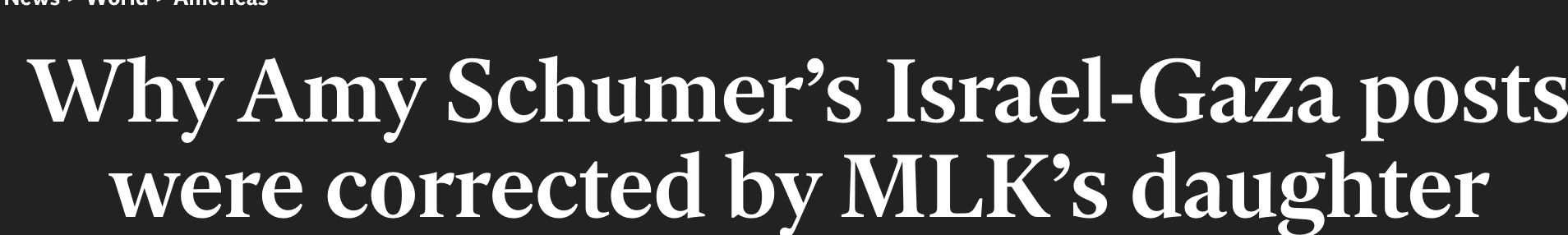 Both Sandberg and Messing have announced documentary film projects that take up various aspects of hasbara, and Amy Schumer continues to light up social media with hot takes that end with her getting schooled by Dr. Bernice King (MLK’s daughter). If you’re ever wondering what kind of feminism you embrace, ask yourself if it’s the kind of feminism that is FOR the bombs dropping and the genocide or AGAINST them, then work backwards from there.