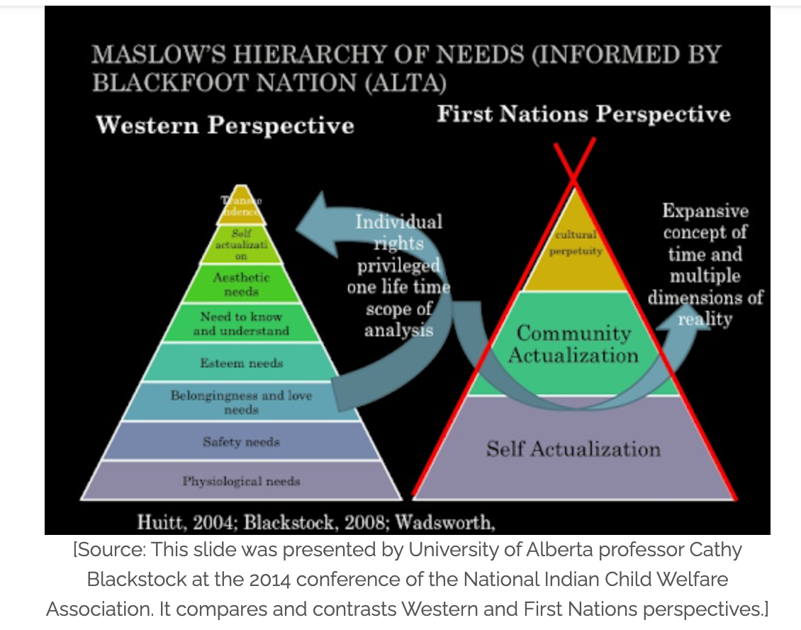 Given this, it was a revelation when just last week I learned that Maslow stole the idea for the “hierarchy of needs” from the Blackfoot Nation. And, when he did this, he stripped out their idea of COMMUNITY ACTUALIZATION and replaced it with SELF.