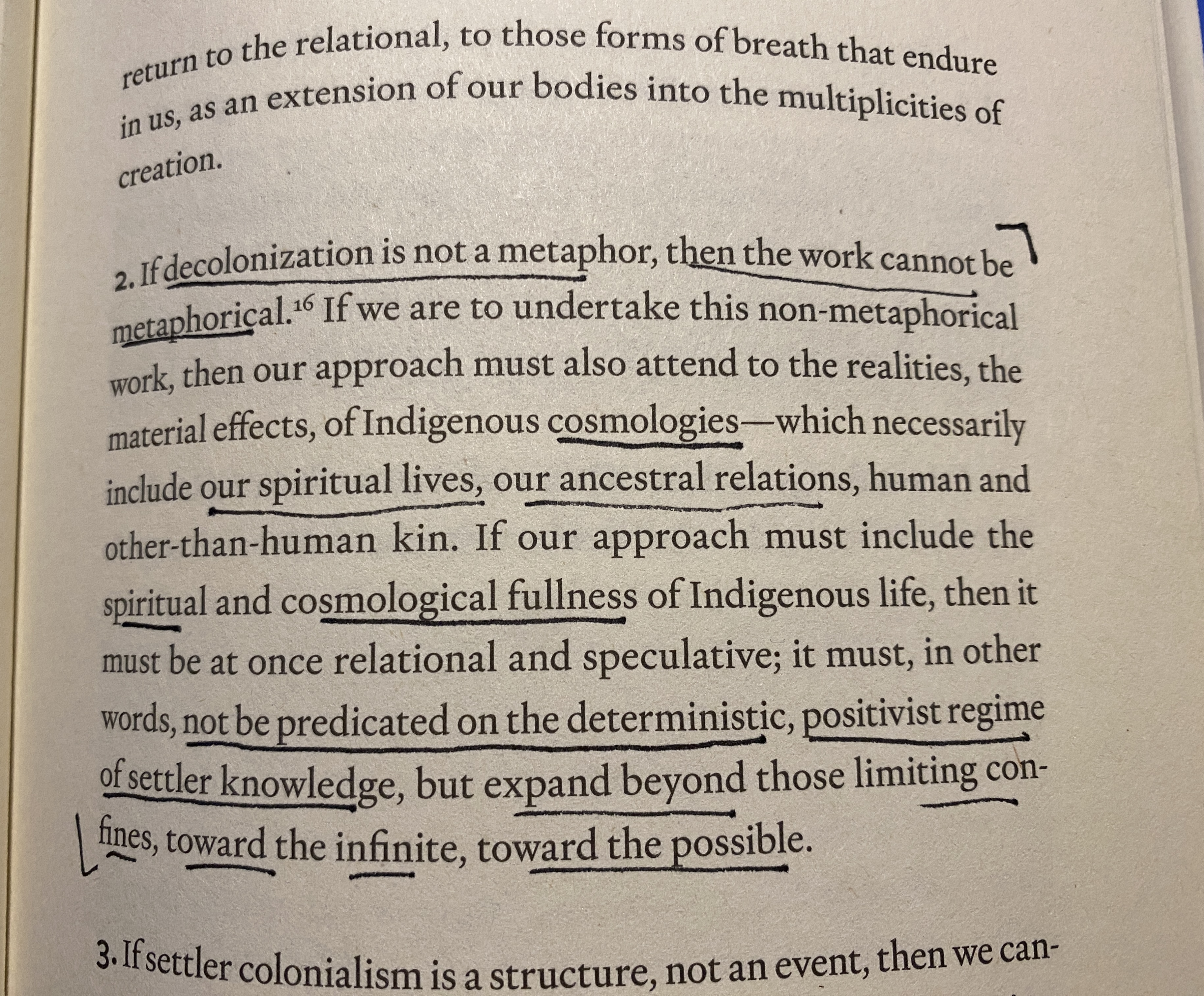 If decolonization is not a metaphor, then the work cannot be metaphorical. If we are to undertake this non-metaphorical work, then our approach must also attend to the realities, the material effects, of Indigenous cosmologies — which necessarily include our spiritual lives, our ancestral relations, human and other-than-human kin. If our approach must include the spiritual and cosmological fullness of indigenous life, then it must be at once relational and speculative; it must, in other words, not be predicated on the deterministic, positivist regime of settler knowledge, but expand beyond those limiting confines, toward the infinite, toward the possible. (emphasis in bold added)