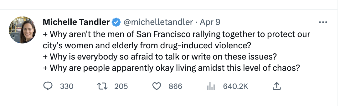 Tandler also wondered why the “men of San Francisco” are not “rallying together to protect” San Francisco’s “women” and “elderly.”