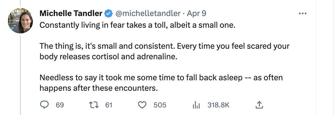 I don’t understand why Tandler would willingly float the idea of hey, let’s do human rights violations in a thread unless there was some compelling reason underneath it. Part of it is fear, I think. At one point in her thread, Tandler mentions her fear and the way that shows up in her body: