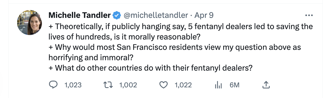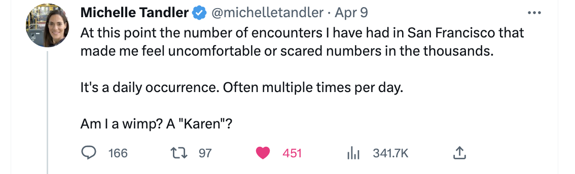 I hope that Michelle Tandler reads this and learns something. She lit up the Internet on that dying bird app recently with a controversial thread about what it’s like for her to live in San Francisco among unhoused drug users who have the gall to exist near her apartment. Tandler is, according to her LinkedIn profile, CEO of a tech firm called Growth Path, and has an MBA from Harvard.