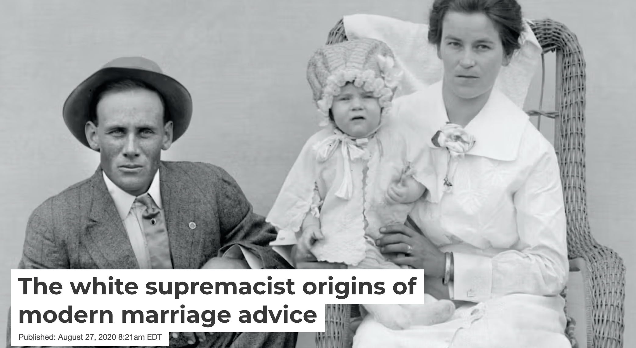 Did you know that the first self-help books for couples were written by proponents of the eugenics movement? You know the eugenicists, that ostensibly scientific project intended to encourage reproduction among the white middle class, while discouraging or preventing population growth among people of color and the poor, the theory that gave rise to the Third Reich? Yeah, that eugenics. Popularized first in the U.S., then exported to Germany.