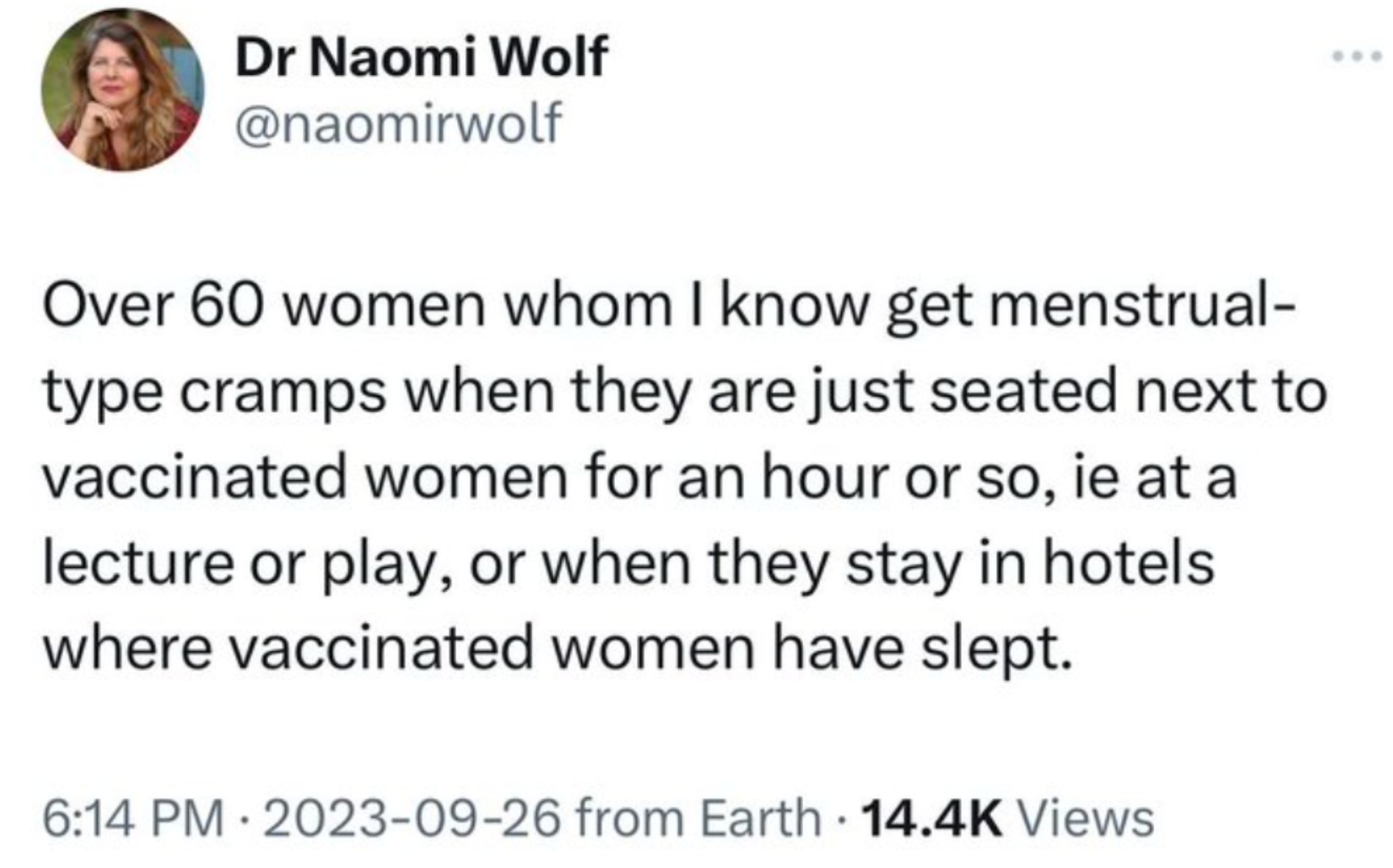 In the intervening years, Naomi Wolf (the other Naomi) has often been confused with Naomi Klein, who is also a writer, and the author of The Shock Doctrine: The Rise of Disaster Capitalism, and No Logo: No Space, No Choice, No Jobs, among several other titles. Naomi Klein is an outspoken critic of capitalism and the way it is driving the destruction of the planet, and thus, politically to the left of most in the U.S. Yet, she is frequently mistaken for the other Naomi, the one that’s gone down the rabbit-hole of far-right conspiracy theories.