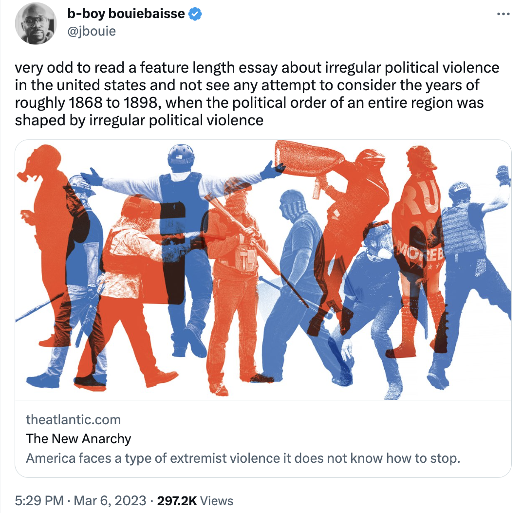 I had to go have a look at that bird app once I got done reading it to see if anyone else had picked up on what I had in this mess of an article, and of course, the fabulous Jamelle Bouie called it when he said, “Very odd to read a feature length essay about irregular political violence in the united states and not see any attempt to consider the years of roughly 1868 to 1898.” Yeah, very odd, indeed.