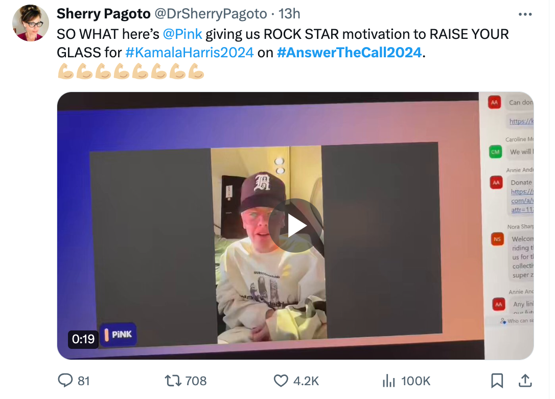 The discourse on social media about it looked a lot like this post with lots of this kind of “raise your glass” energy, which is the name of a song by pop singer Pink, who also joined the call, along with sports stars Megan Rapinoe and Sue Bird, the actor Connie Britton, and the influencer Glennon Doyle.