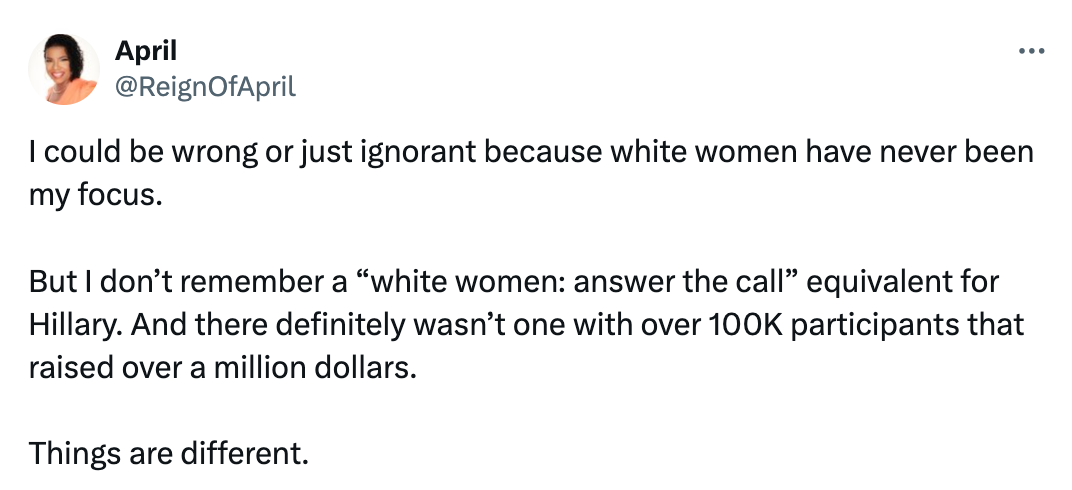 She’s right, this feels different. It’s a smart move politically to intentionally target white women and try to galvanize them around a Democratic candidate who is a Black and South Asian woman.