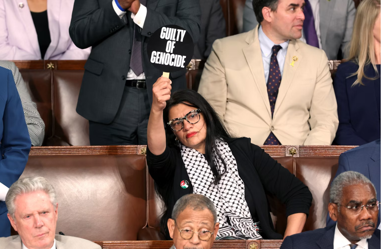 So, the question becomes, will it be possible to force Harris to stop arming Israel so it can “finish the job faster” as Israel Prime Minister and war criminal Benjamin Netanyahu said before the U.S. Congress on Wednesday this week. The lone profile in courage came from Rep. Rashida Tlaib, who was the only member of Congress to dissent in the chamber. She did so by holding up a sign that read “War Criminal” on one side, and “Guilty of Genocide,” on the other. This is the clarity of conviction that’s made the current moment of mobilizing white women possible.