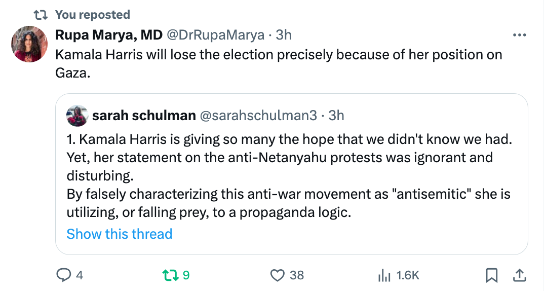 This is where we are. I agree with Dr. Marya that Harris will lose (and should) if she can’t shift her position on Gaza. Right now is the time to demand this of her campaign.